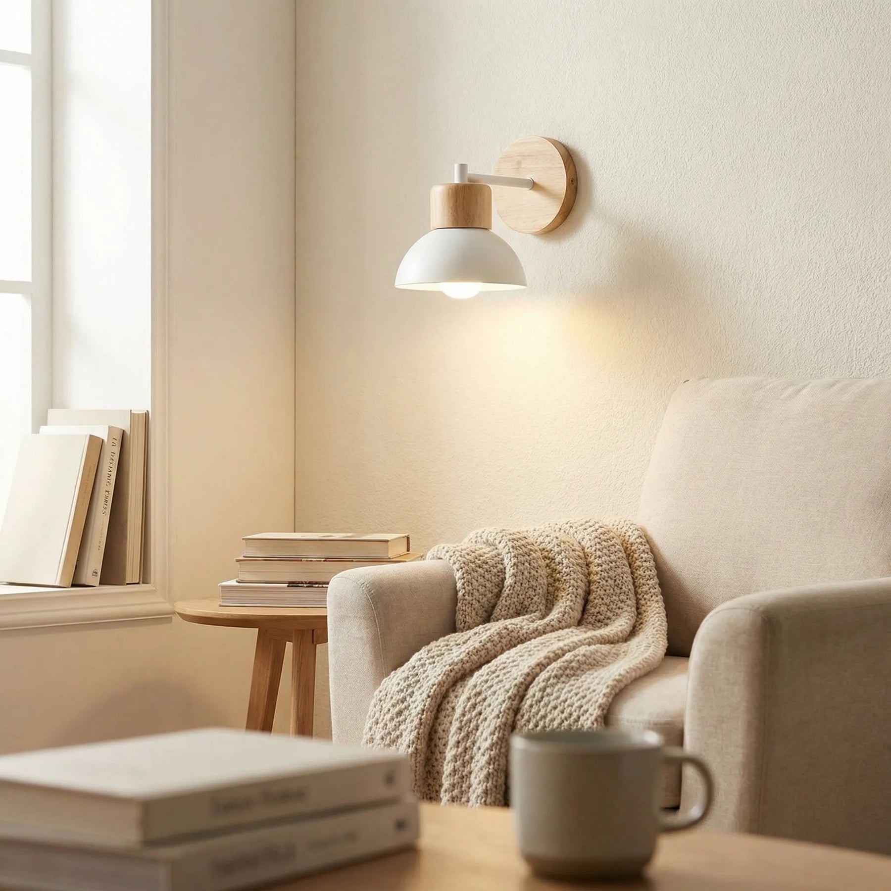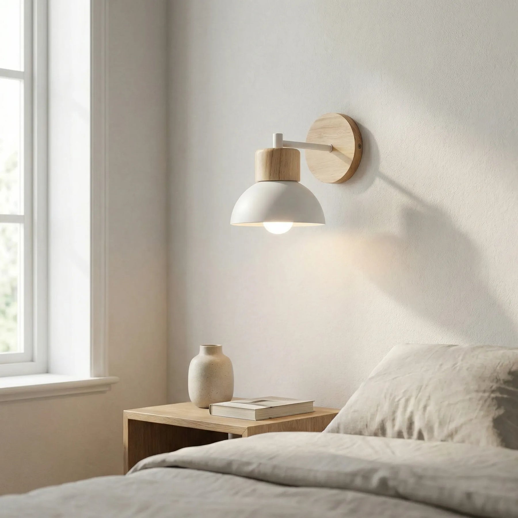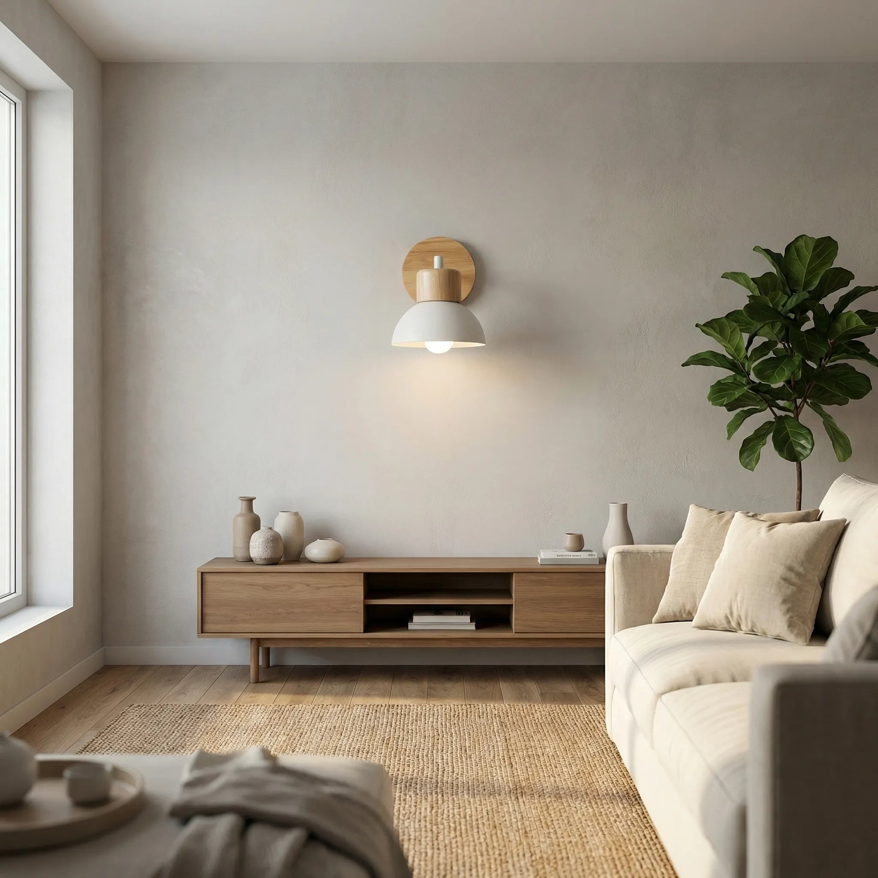 A compact wall light that combines a dome-shaped shade with a warm natural base.