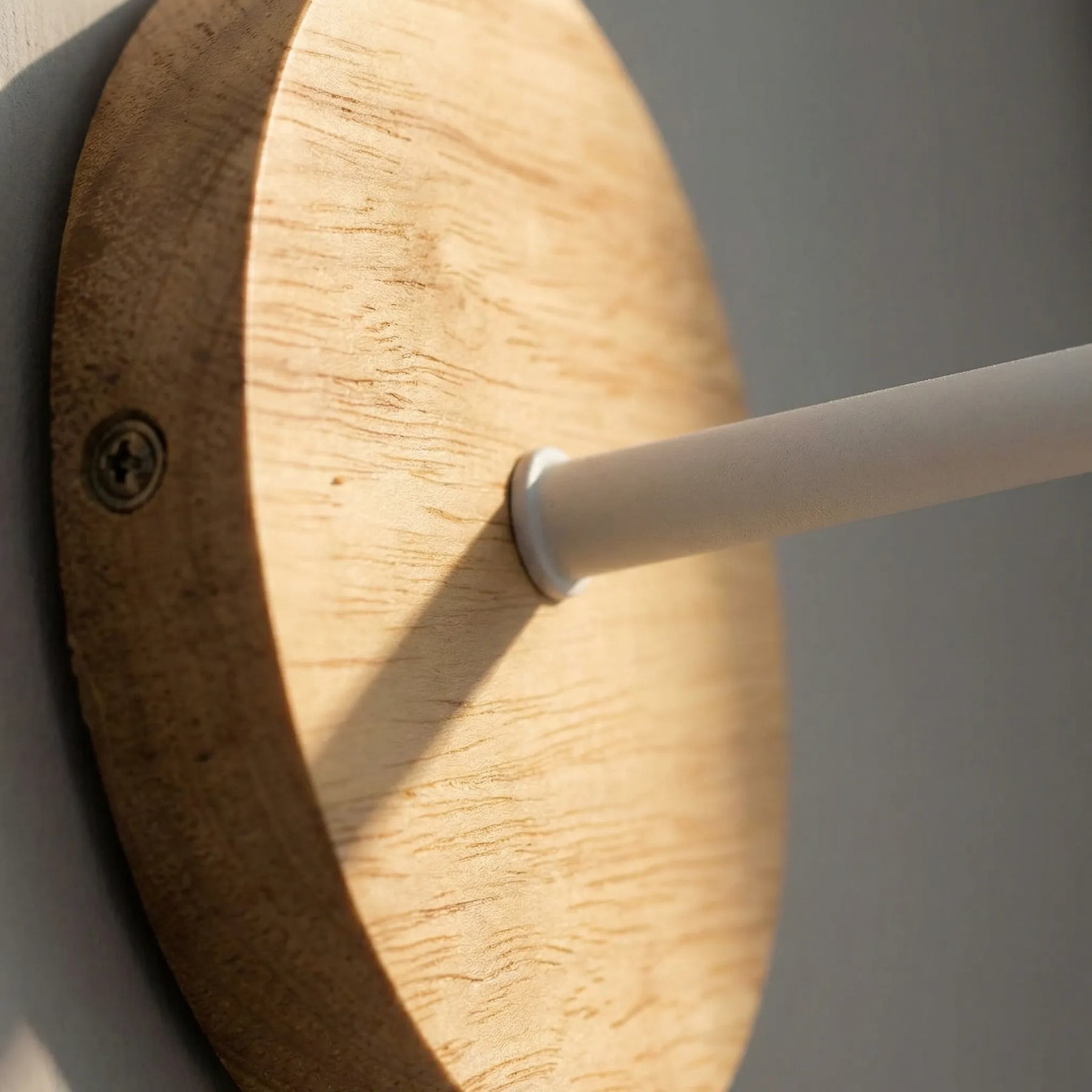 • Warm natural detail: The wooden collar and circular wall plate add an organic warmth that sets this fitting apart from purely industrial or plain metal alternatives.